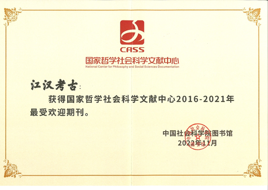 国家哲学社会科学文献中心于2016年9月由中国社会科学院按照中共中央宣传部部署牵头建设,2016年12月正式上线,是目前最大的中文哲学社会科学开放获取学术平台。截止2021年底,累计上线期刊2149种,其中核心期刊735种,国家社科基金重点资助期刊172种。《江汉考古》获评“最受欢迎期刊”,充分反映出学界同仁、广大读者对刊物的高度认可与充分肯定。
