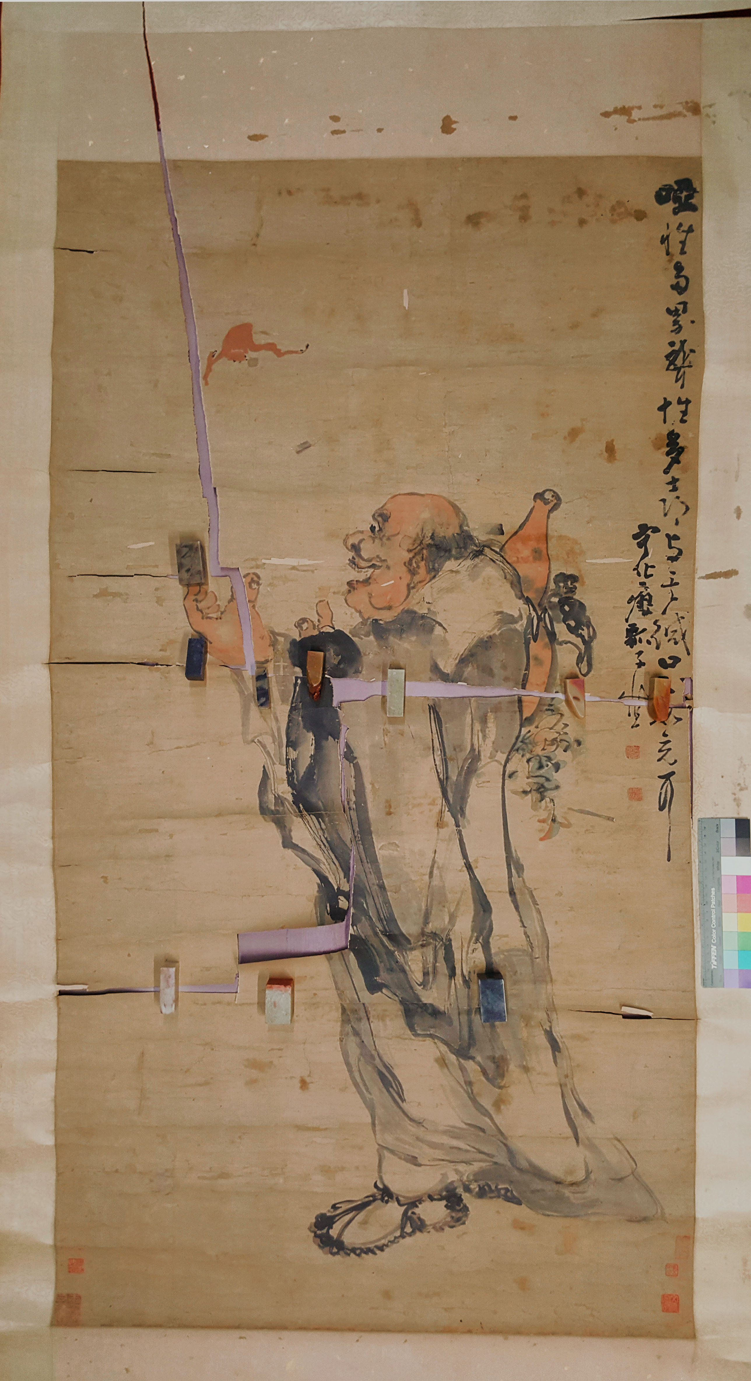 “正面滚浆加固法”修复清代扬州八怪黄慎“接福图”中堂(修复前)