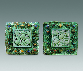 Gilt bronze pillow finial inlaid with gemstones and jade