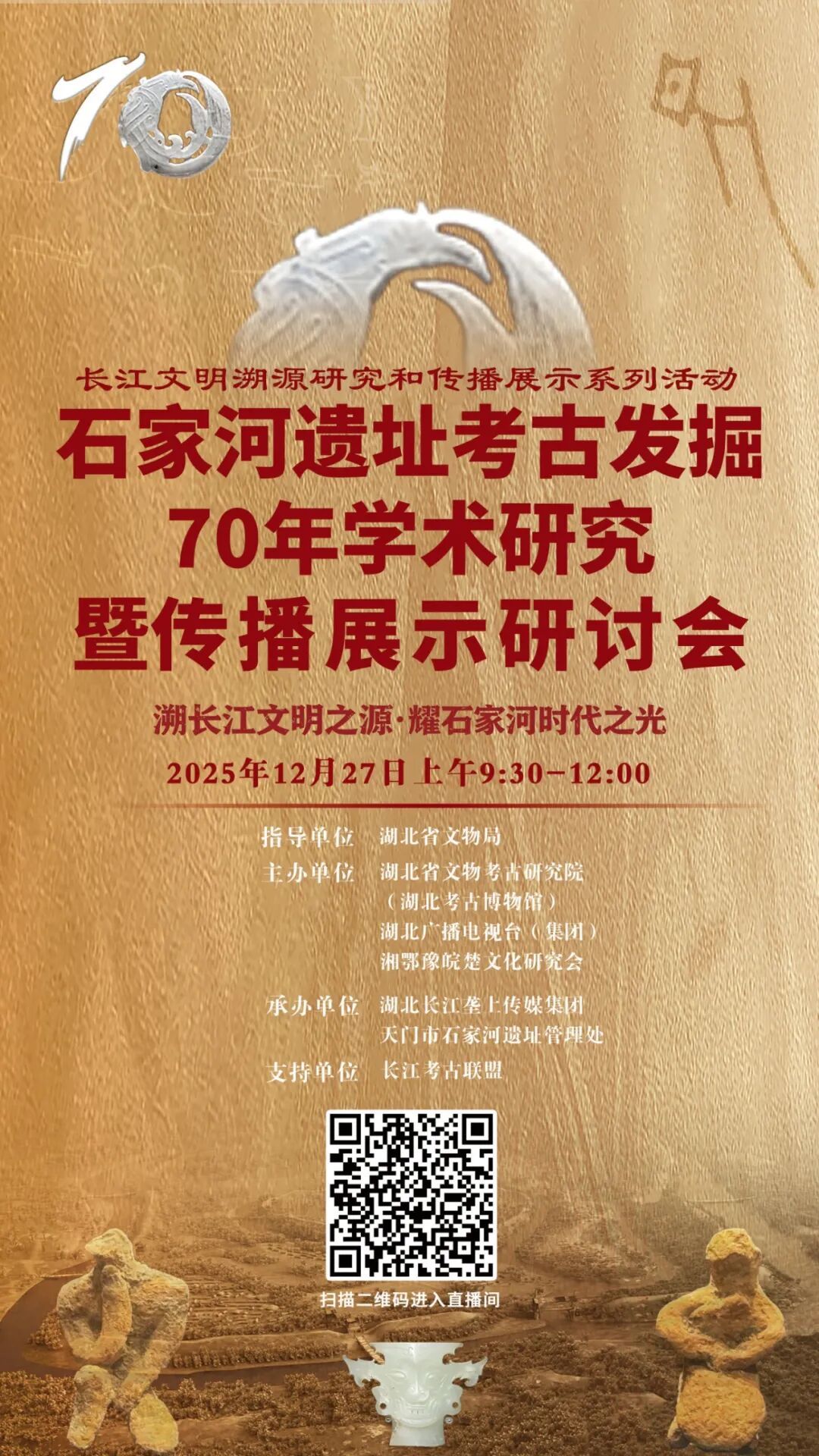 为深入学习贯彻习近平文化思想,落实习近平总书记关于保护传承弘扬长江文化的重要讲话精神,特别是“加强长江文明溯源研究和传播展示”的工作要求,进一步深化长江文明研究、建设长江文化高地,值石家河遗址考古发掘70周年之际,定于2025年12月27日举办 “石家河遗址考古发掘70年学术研究暨传播展示研讨会”,现将具体事宜通知如下: