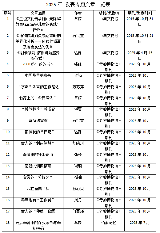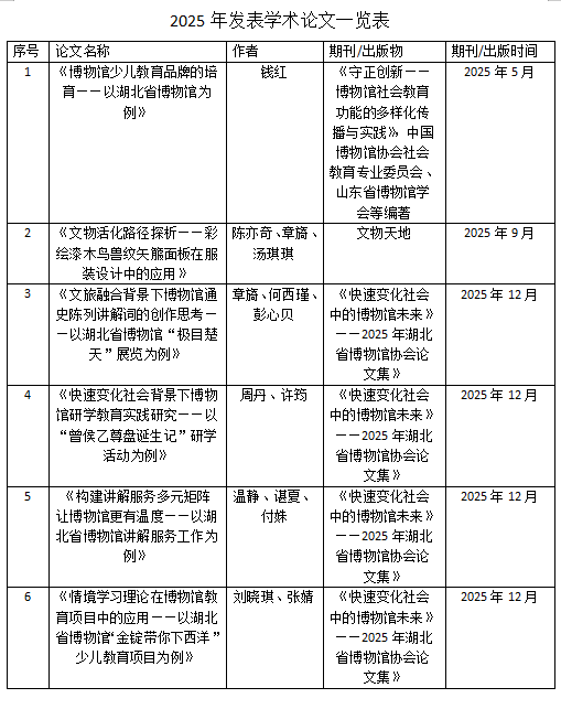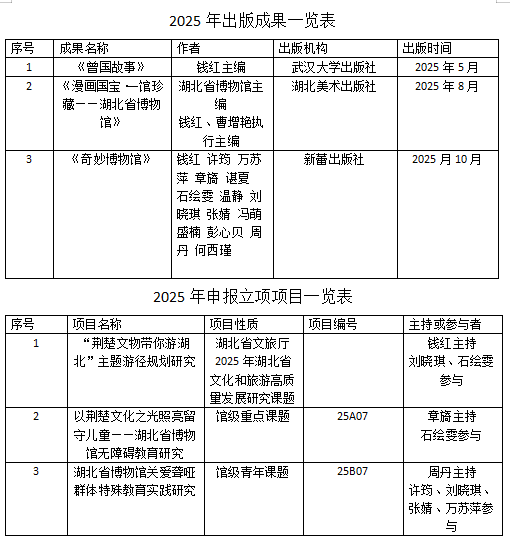 专著、出版物与课题:出版《曾国故事》《湖北省博物馆(绘本)》2本书,发表专业文章23篇,1项省级、2项馆级课题获批立项。