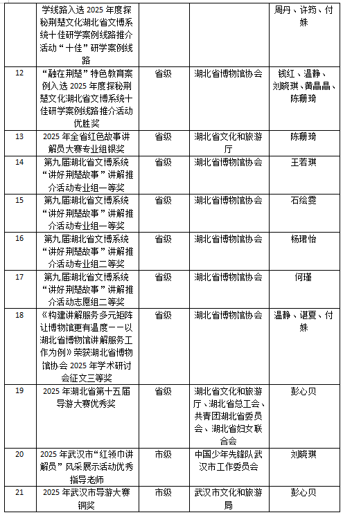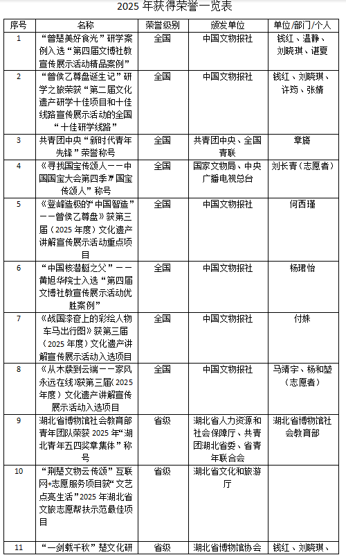 省级奖项10项:部门获“湖北青年五四奖章集体”荣誉称号、“荆楚文物云传颂”志愿服务项目获2025年湖北省文旅志愿帮扶最佳示范项目等。