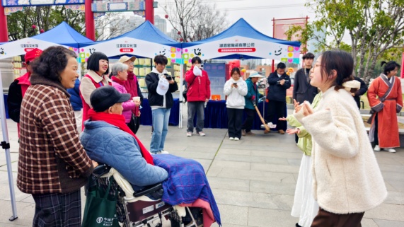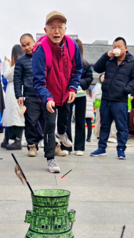 沉浸式体验活动现场欢声笑语不断,成为市民打卡的热门点位。“投壶”游戏区里,男女老少跃跃欲试;“十件镇馆之宝知识小课堂”上,志愿者通过趣味问答的形式,带领市民快速认识湖北省博物馆“明星”藏品,激发大众走进博物馆的参观兴趣;“文物猜谜”区域前更是排起长队,观众们开动脑筋破解文物、历史人物相关谜题,在智趣挑战中收获文博知识与精美礼品,让文博体验充满乐趣。