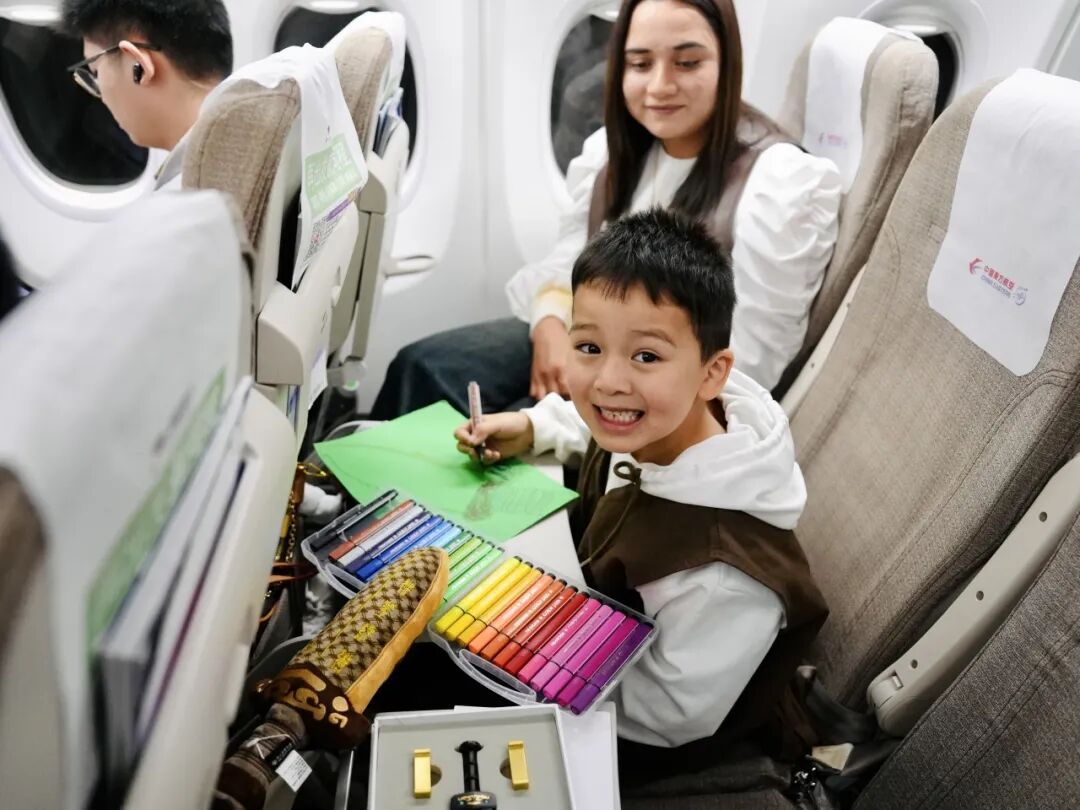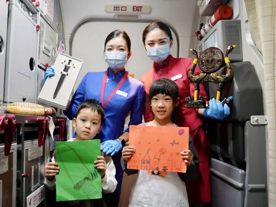 欣赏过一件件精美绝伦的文物纪念款,机上旅客望月抒怀,品味传统文化中的团圆与相思。两位小旅客主动化身“小小文物讲解员”为大家介绍越王勾践剑、虎座鸟架鼓等湖北省博物馆“镇馆之宝”,并向大家展示自己的中秋绘画。