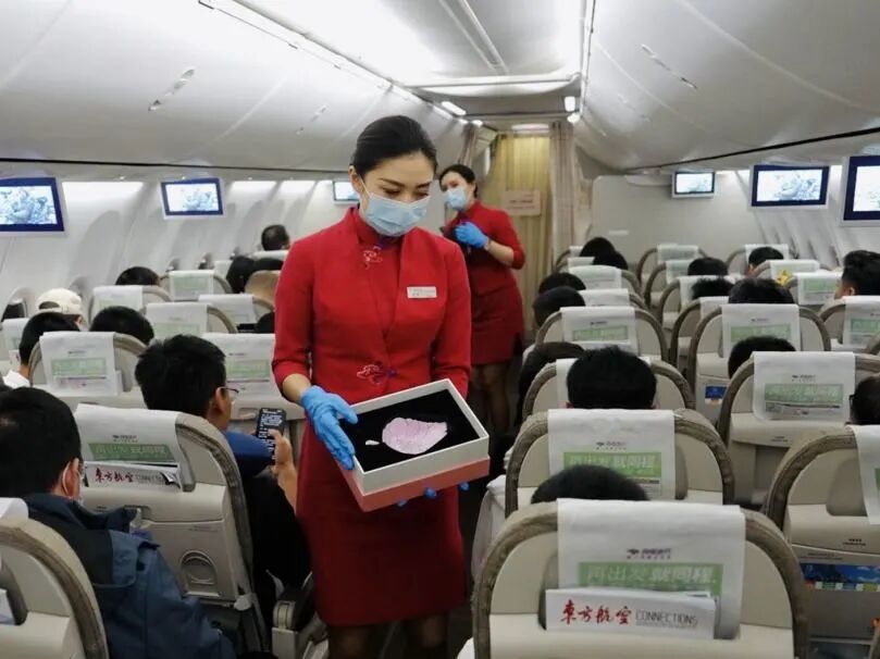 “欢迎您搭乘由湖北省博物馆和东航武汉公司与一同打造的中秋特色主题航班。一轮明月如约跃上江城夜空,映照着这方水土。在家的人、远来的客,在这中秋节特别的日子里,我们穿越蓝天白云,携手体验中国文化的魅力。”在地面登机程序结束后,随着预告广播在客舱中响起,主题活动正式拉开了序幕。