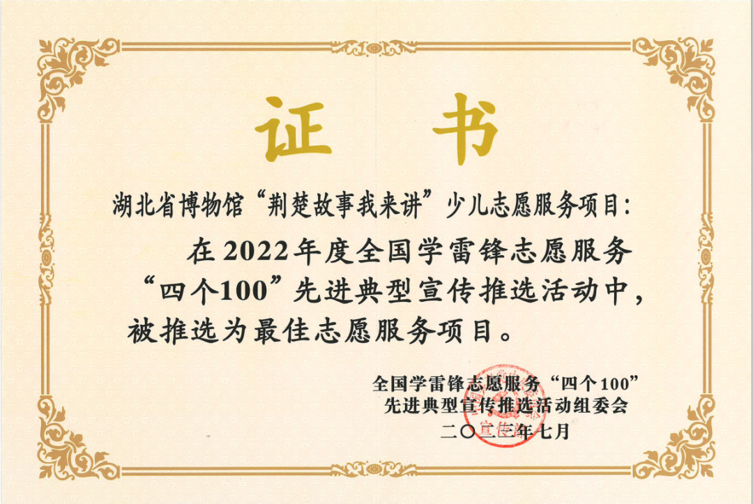 7月30日,湖北省博物馆“荆楚故事我来讲”少儿志愿服务项目经国家文物局推荐,获评2022年度全国学雷锋志愿服务“四个100”先进典型之“最佳志愿服务项目”。