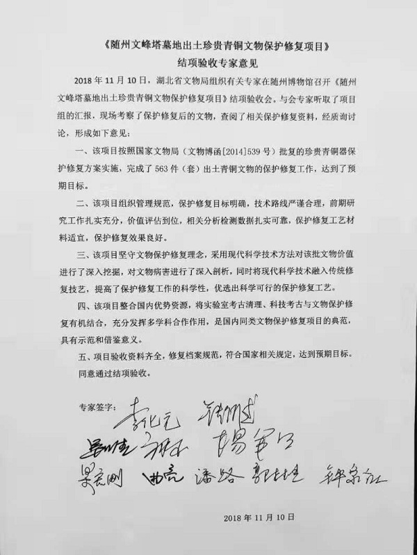 2018年11月10日,湖北省文物局在随州组织召开了“随州文峰塔墓地出土珍贵青铜文物保护修复项目结项验收会”,会议邀请了来自故宫博物院、国家博物馆、中国社会科学院考古研究所、西北工业大学、荆州文物保护中心、山西博物院、河北省文物保护中心等单位的十几位专家组成专家组进行验收评审,同时按照省财政厅、省文物局的相关规定组织了财务验收。