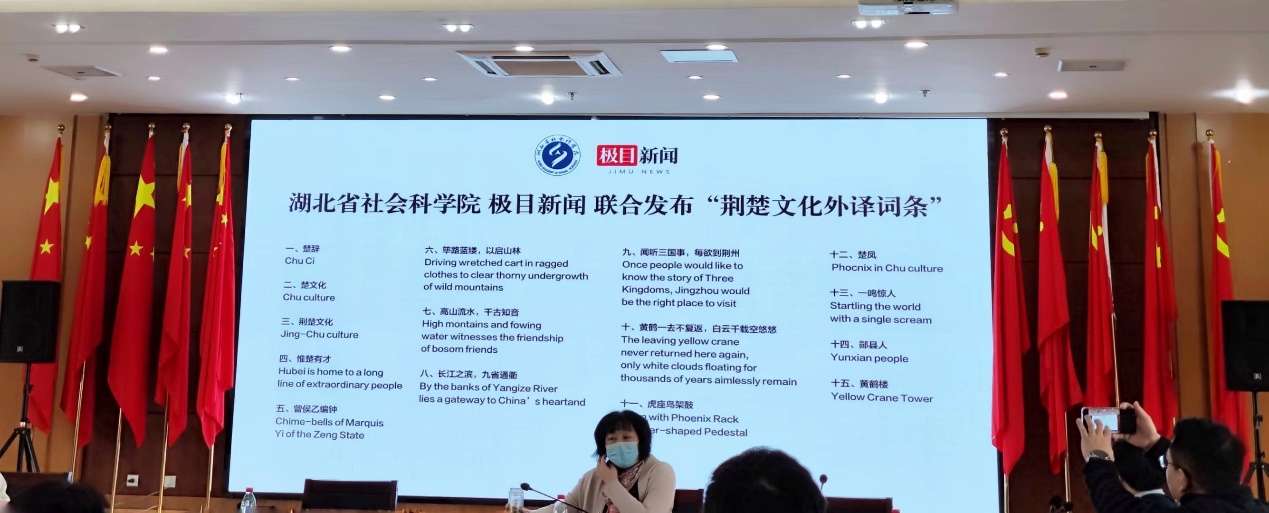 会上,湖北省社科院、极目新闻联合发布了“楚辞”“筚路蓝缕,以启山林”“黄鹤一去不复还,白云千载空悠悠”等荆楚文化外译词条。
