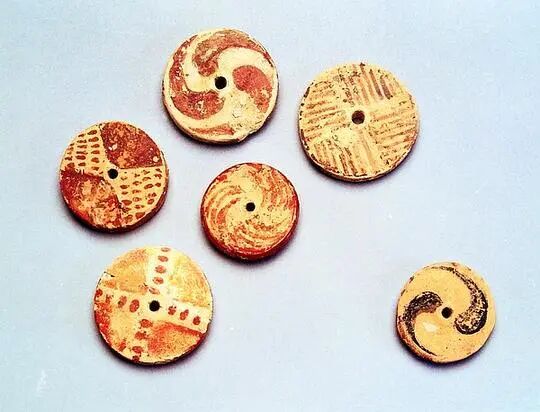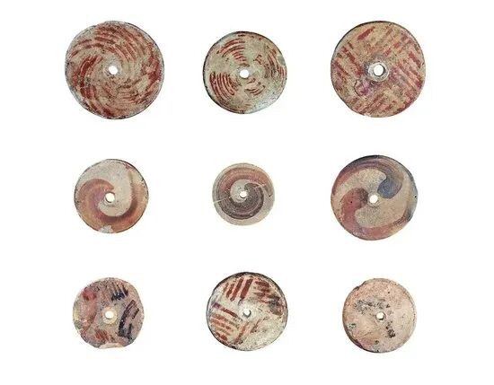 纺轮纹饰种类繁多,有漩涡旋转的花纹,宛如自然界中的水流漩涡,充满了动感与神秘;有笔直如尺的直线纹路,体现了先民们对直线的追求与把握;还有密密麻麻的点状纹,以及一圈圈同心的弧线纹样,它们共同构成了纺轮上的一幅幅生动画面。最值得一提的,莫过于那些象征生生不息的双鱼纹图案,它们巧妙地围绕着纺轮的中心点展开,仿佛在诉说着生命的奥秘与轮回。