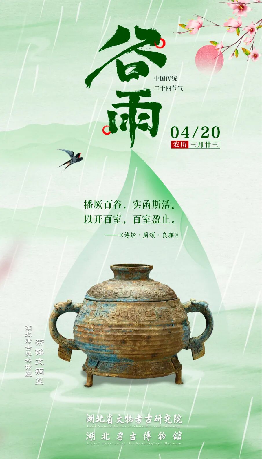 “清明后十五日,斗指辰,为谷雨,三月中,言雨生百谷清净明洁也。”清明过后,气温渐暖,谷雨到来。谷雨,源自“雨生百谷”,细雨绵绵,滋润着大地,“落絮游丝三月候,风吹雨洗一城花。”漫天柳絮被雨点扫平,抚慰着人们心中的烦躁,迎接着春作物的播种生长。