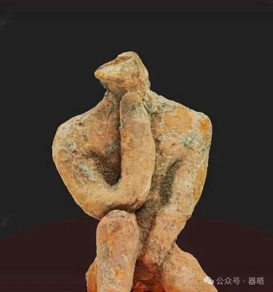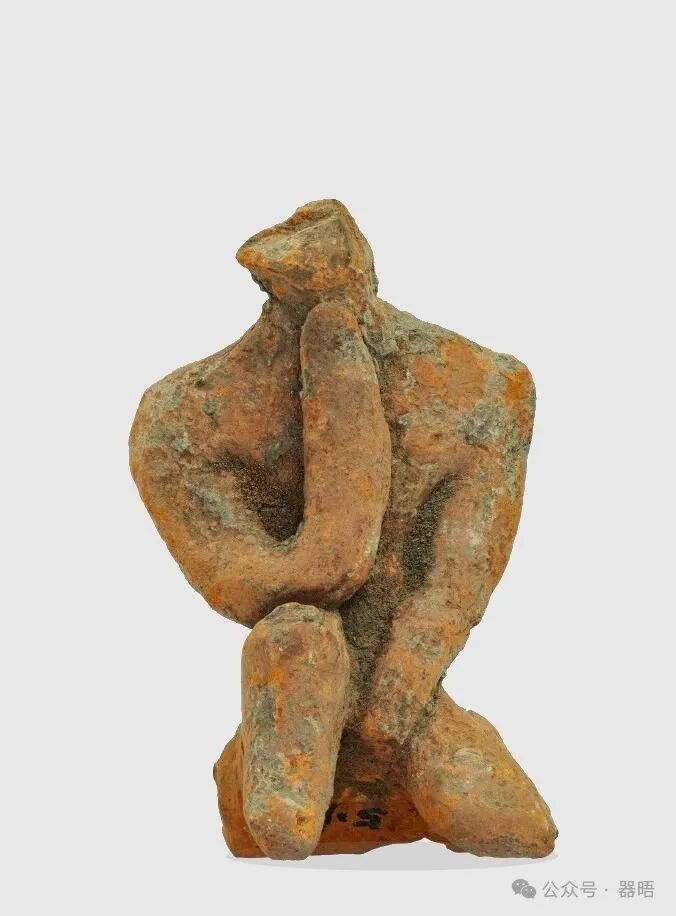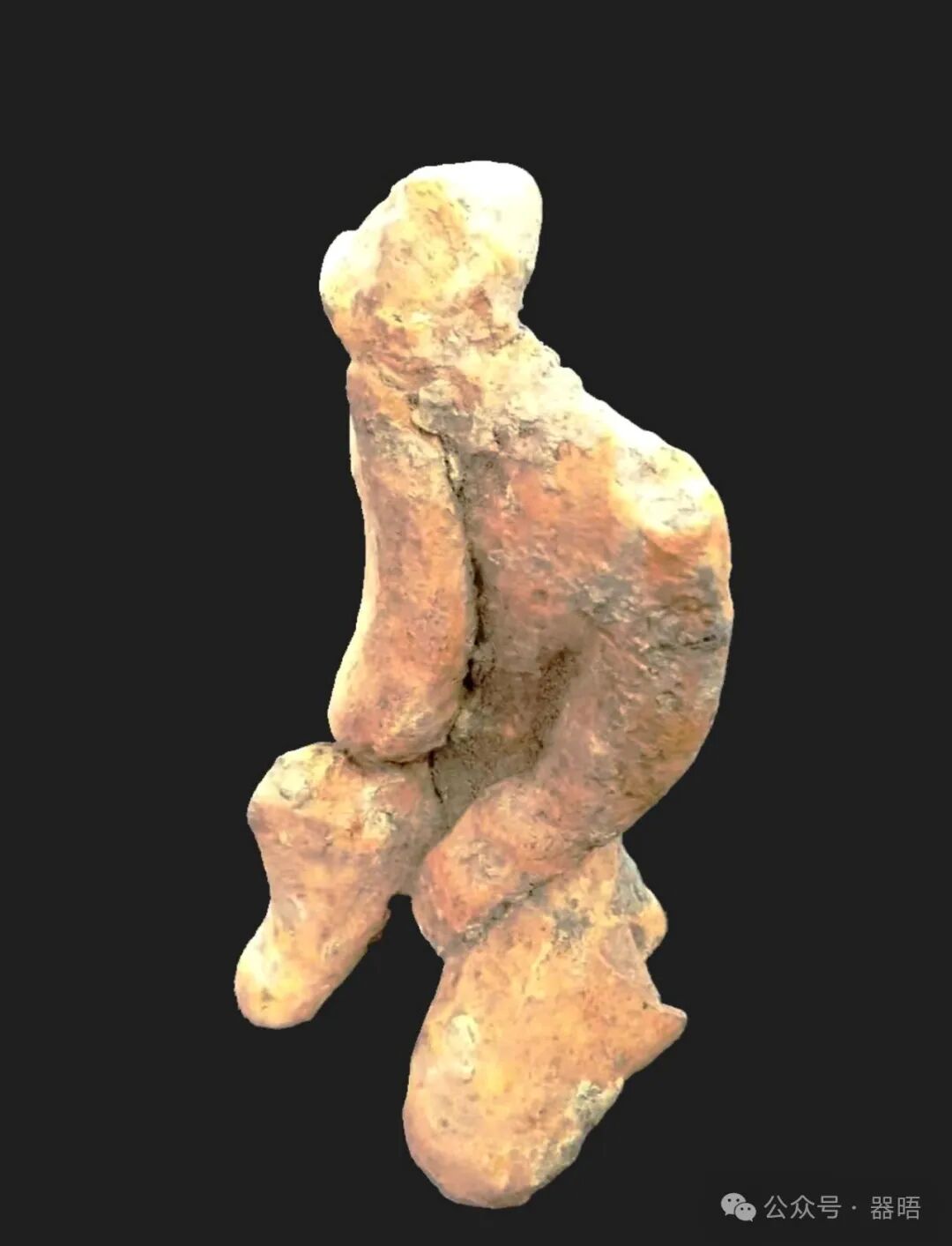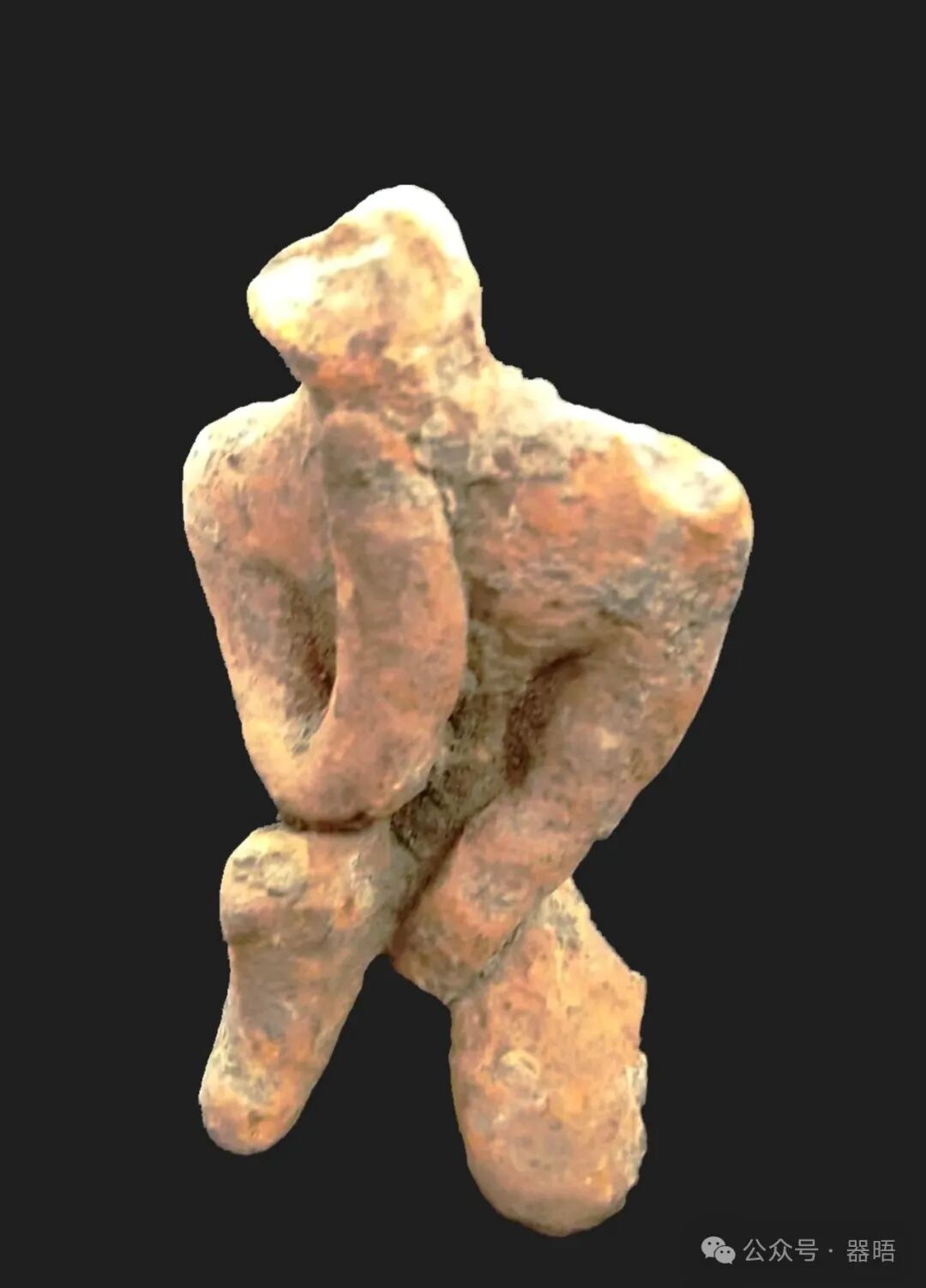 数日前湖北文物考古院方勤院长发来陶塑图片,我看到顿觉惊诧,近日又过手亲眼反复观赏,真是一个难得的发现。这尊陶塑让人立时想到罗丹的雕塑《思想者》,可这却是石家河先民4000年前的作品,感觉到艺术思维穿越时空的巨大魅力。