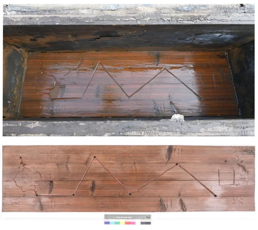 该批纺织品的保存状况和出土数量在湖北省内明代考古中都是首屈一指的,为研究明代中晚期服饰文化提供了珍贵的实物资料。此外,有机质文物中还出土杂项小件竹质折扇、“北斗七星”木质笭床等14件。其中,M3甲出土的“北斗七星”笭床在四角及两端部刻有“天、圆、地、方、乾、坤”字样,头部刻有几何形开光纹呈头像状,内刻“極”字样,中部两侧则刻有不同八卦卦象,以上种种同样是对明代盛行的道教文化和朴素宇宙观的直观表达(图一九)。
