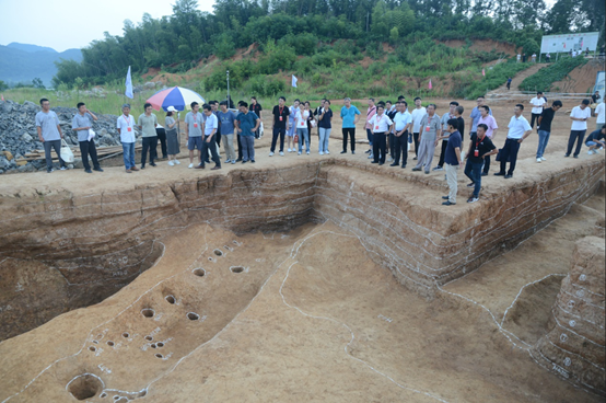 与会学者考察大湖咀遗址出土冶锡遗物的发掘区